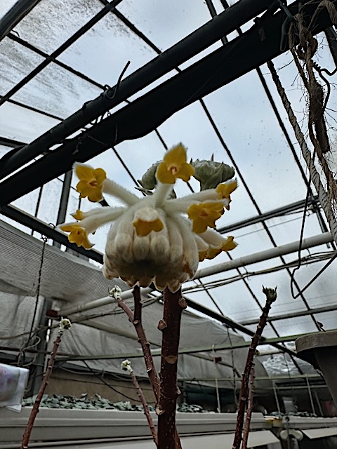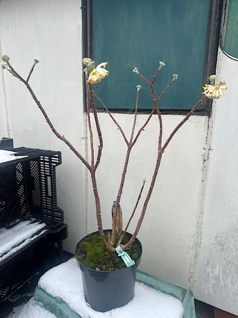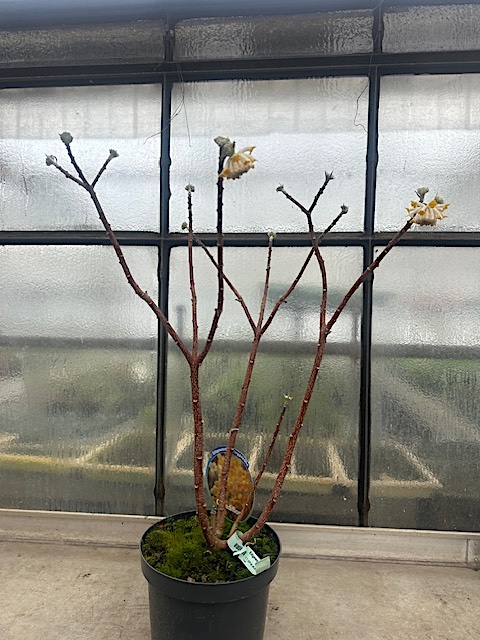 seidig gelb, herlich duftend. Gehölz: die Blüten stehen am Ende des Stieles und duften herlich. Die Rinde wurde in Japan zu Papier hergestellt - Mitsumata- ein langlebiges Papier, welches die buddhistischen Mönche verwendeten- für ihre heiligen Schriften. Auch wurden Banknoten daraus hergestellt.
