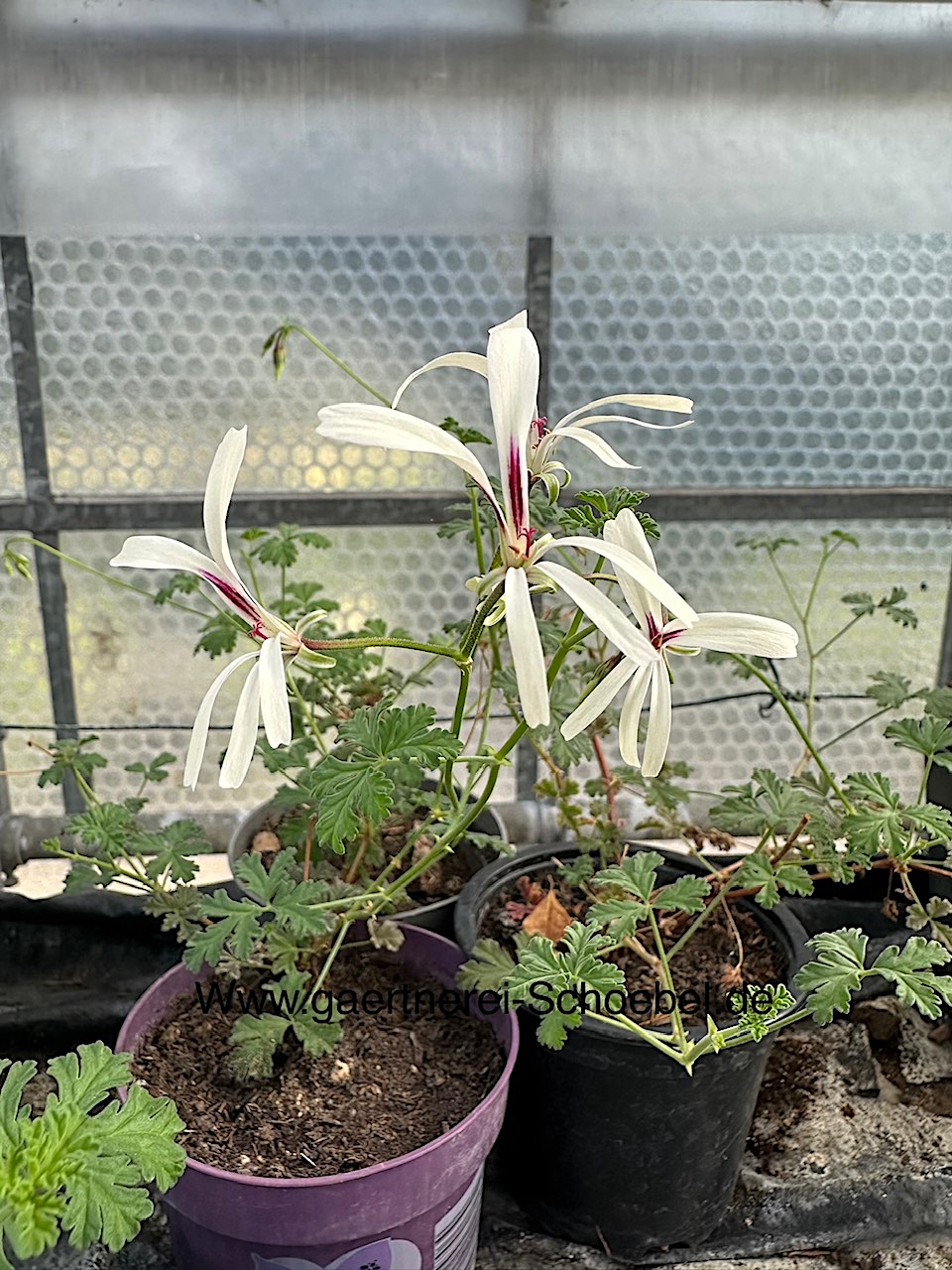 | Farbe: | Blätter:mittelgrün, klein flächig und eingelappt; Blüte: creme- weiß mit offenen Petalen und magenta Mitte. |
